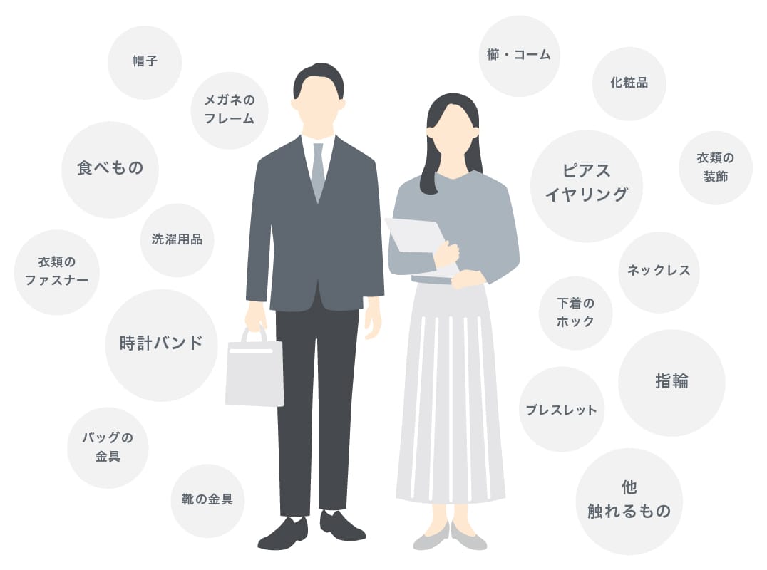 - 金属アレルギーの一般的な症状には、皮膚の赤み、かゆみ、発疹がありますが、重度の場合には呼吸困難や消化不良なども発生する可能性があります。
